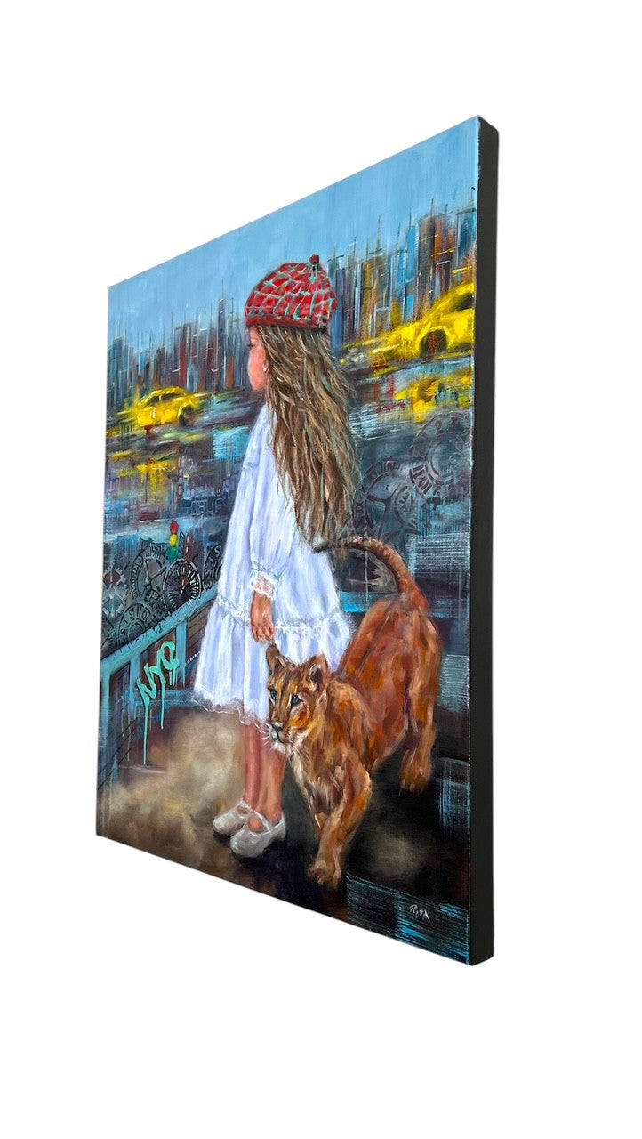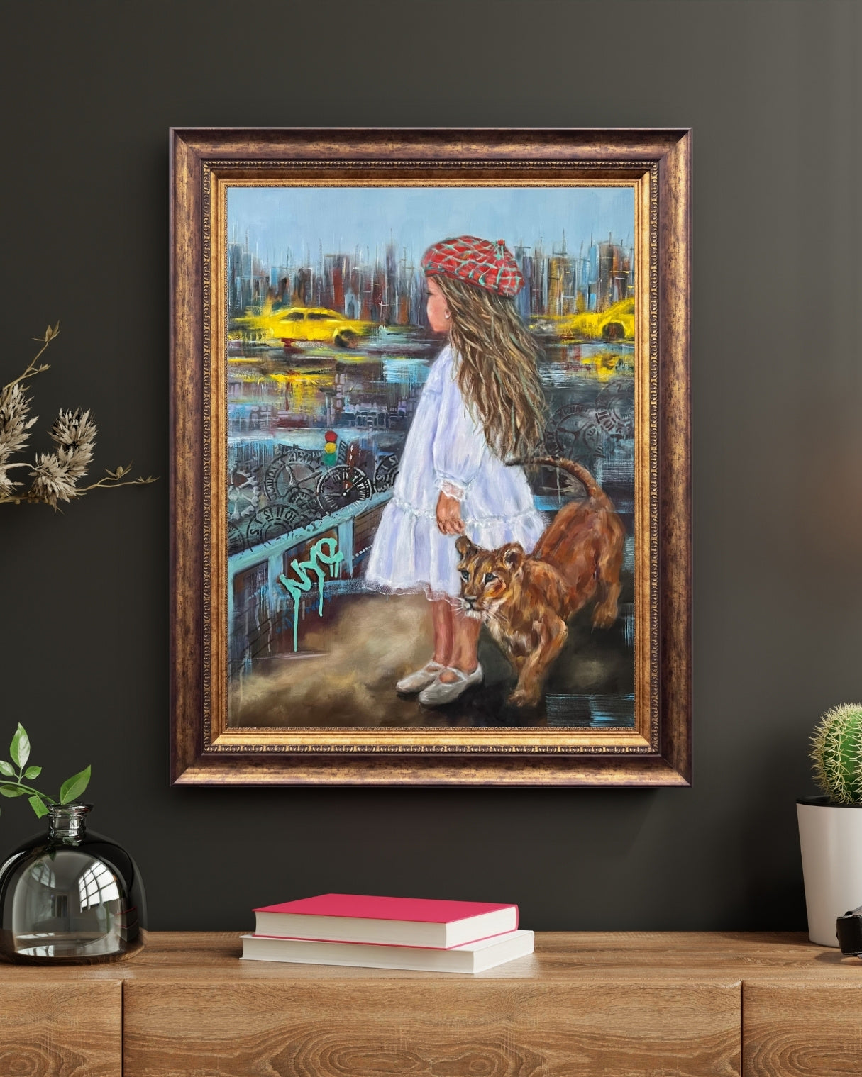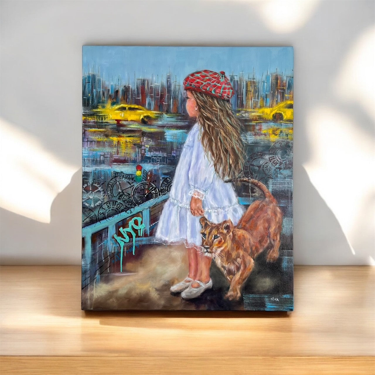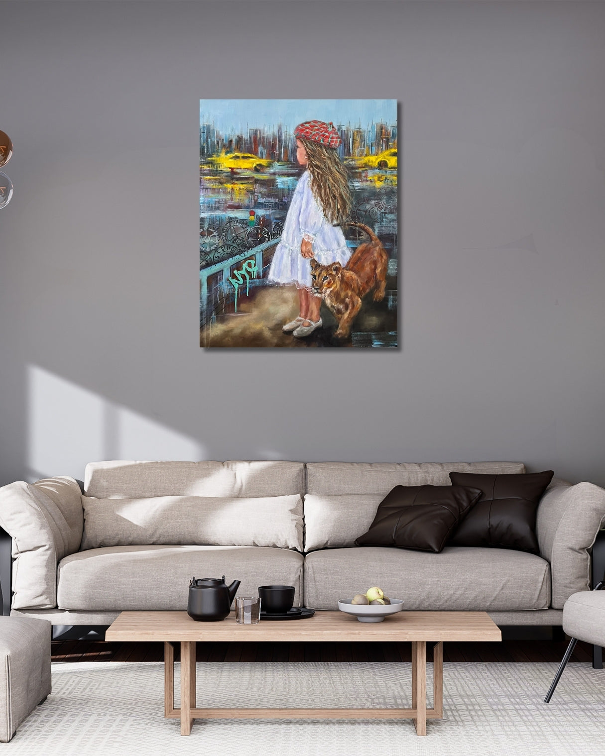 A young girl in a flowing white dress takes a step toward the unknown, carrying both innocence and quiet determination. The city rises behind her, full of promise and uncertainty, symbolizing the future she must discover for herself. At her side stands a baby lion—small yet strong, its golden coat glowing with warmth. Though her path is hers alone, the lion’s steady presence reminds us that even in solitude, we are supported by unseen strength, guidance, and courage.