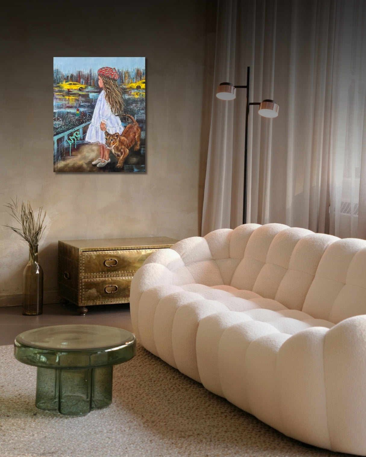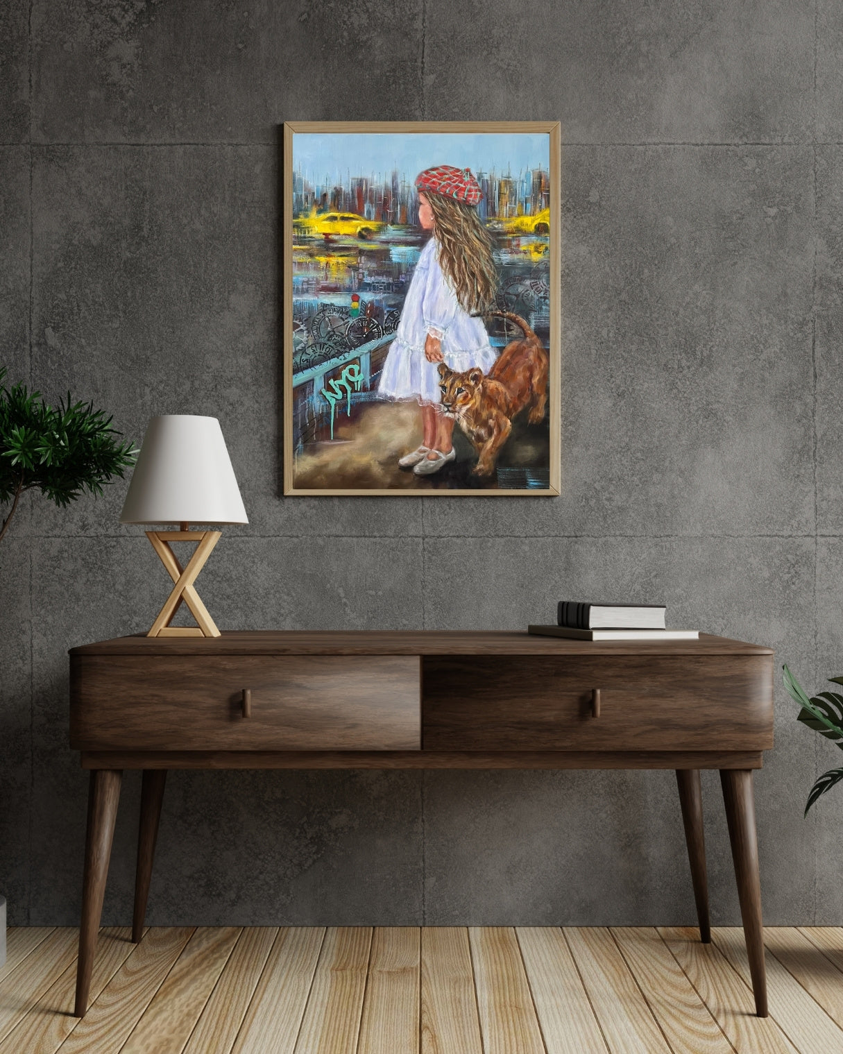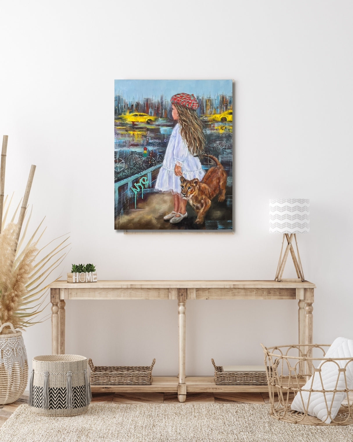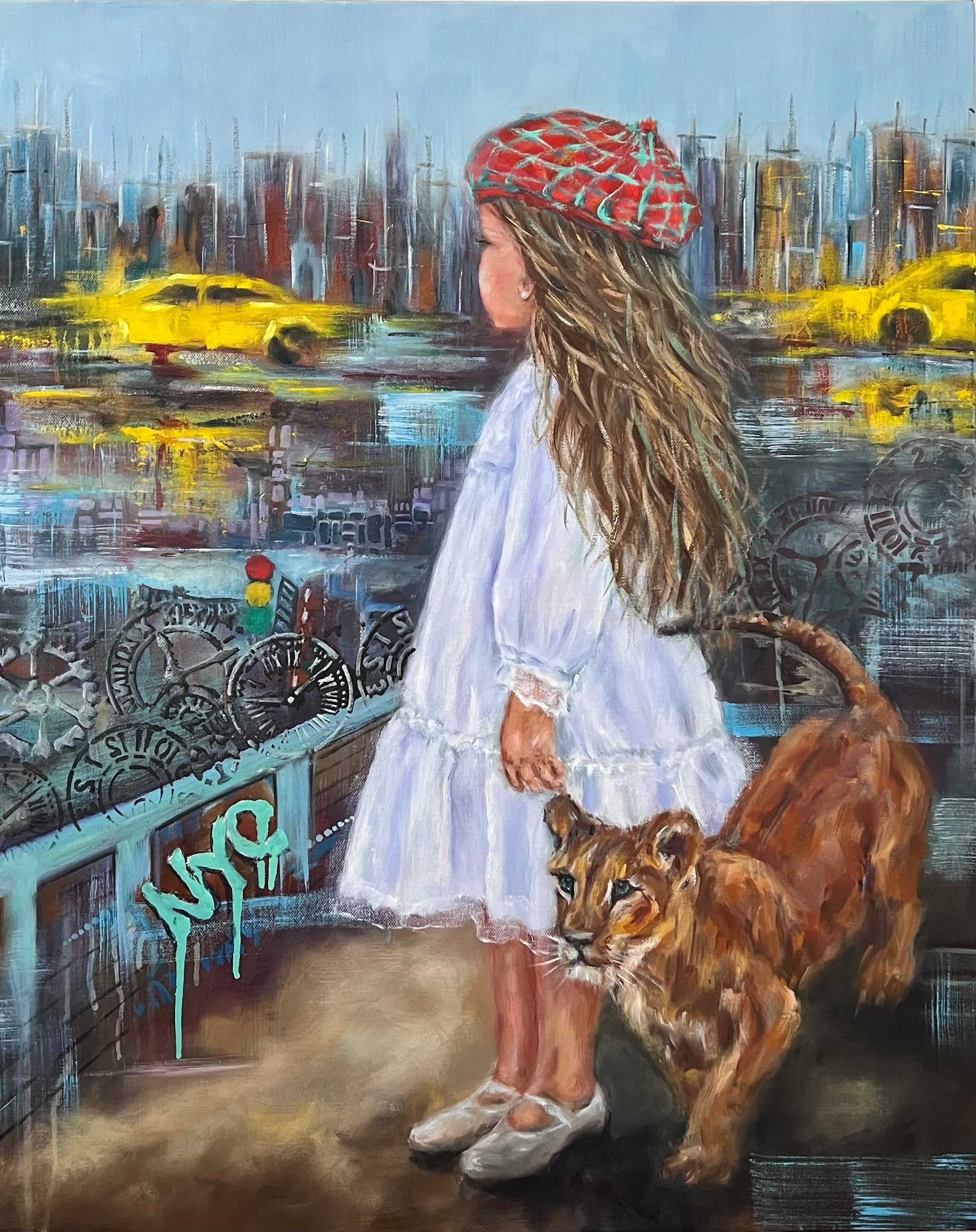 A young girl in a flowing white dress takes a step toward the unknown, carrying both innocence and quiet determination. The city rises behind her, full of promise and uncertainty, symbolizing the future she must discover for herself. At her side stands a baby lion—small yet strong, its golden coat glowing with warmth. Though her path is hers alone, the lion’s steady presence reminds us that even in solitude, we are supported by unseen strength, guidance, and courage.