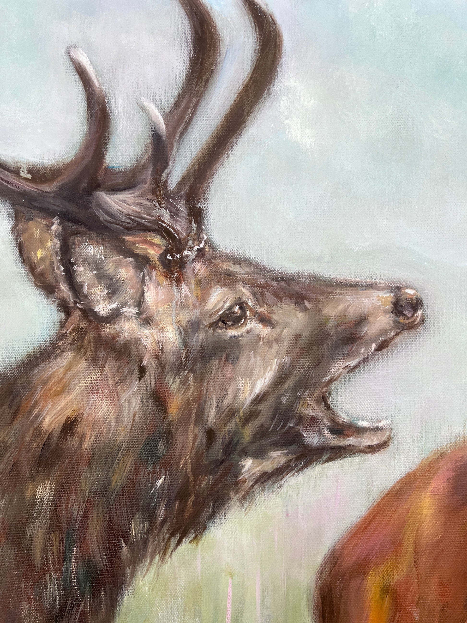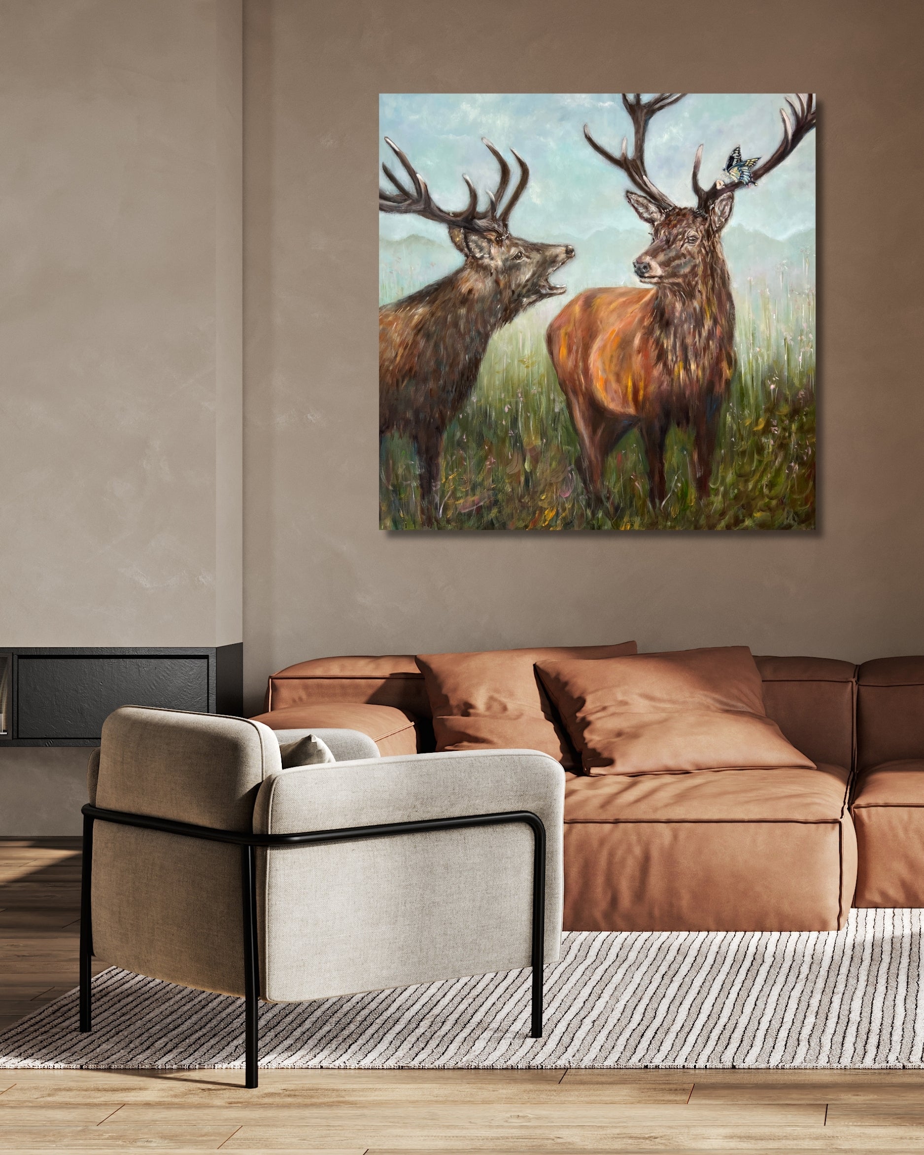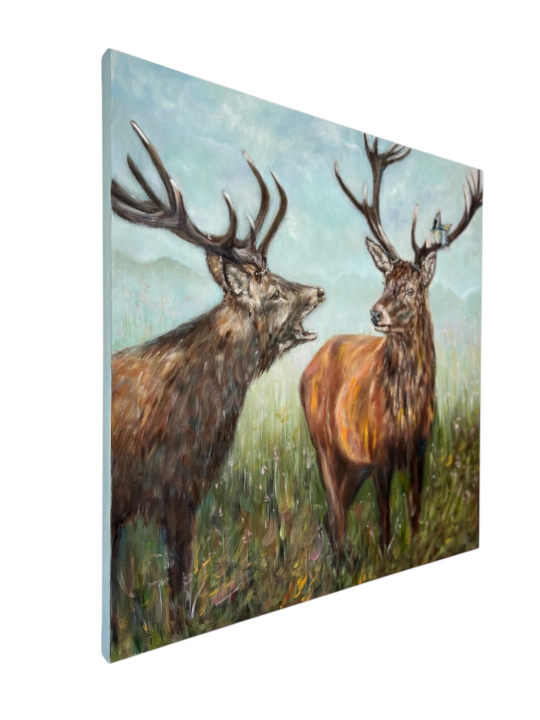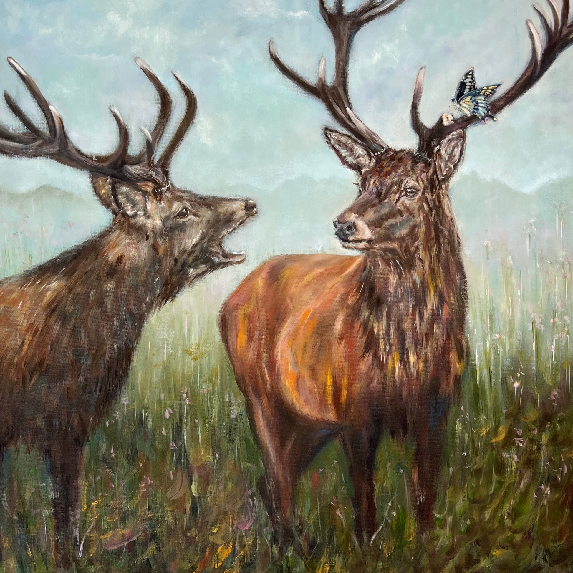 This painting began simply — two stags facing one another. But as I worked, something deeper revealed itself. On the left, one stag calls out, full of restless energy and emotion. On the right, the other stands quietly, gazing back with steady composure. His antler is broken, yet his presence feels grounded — as though he understands something the other has yet to learn.