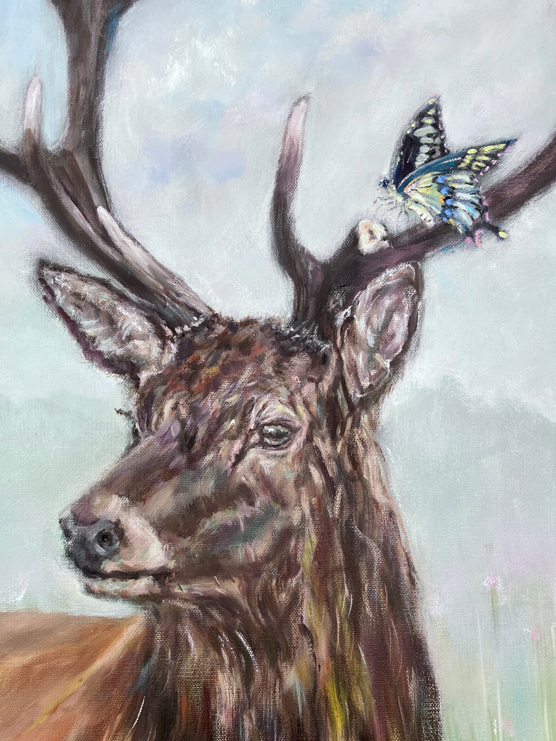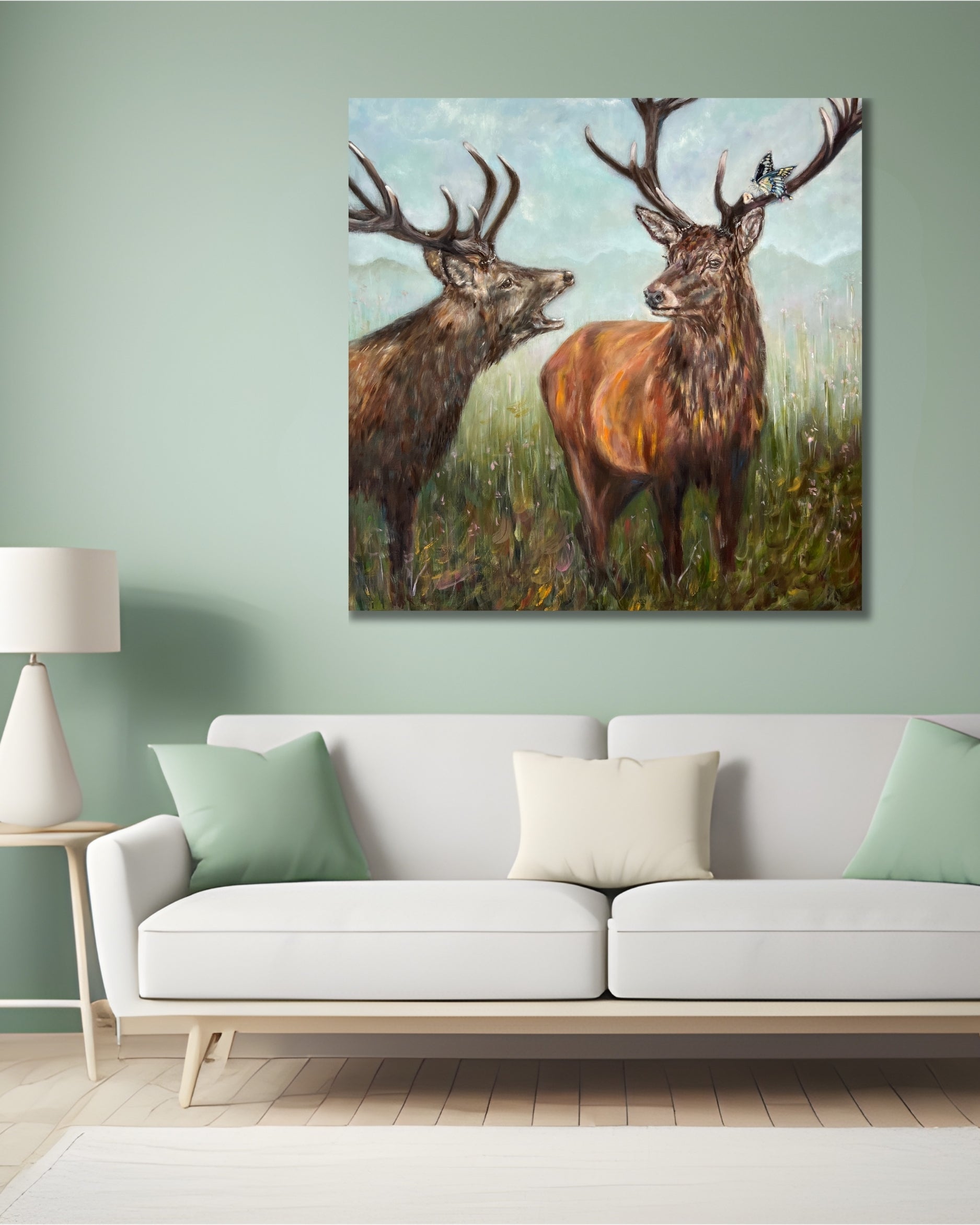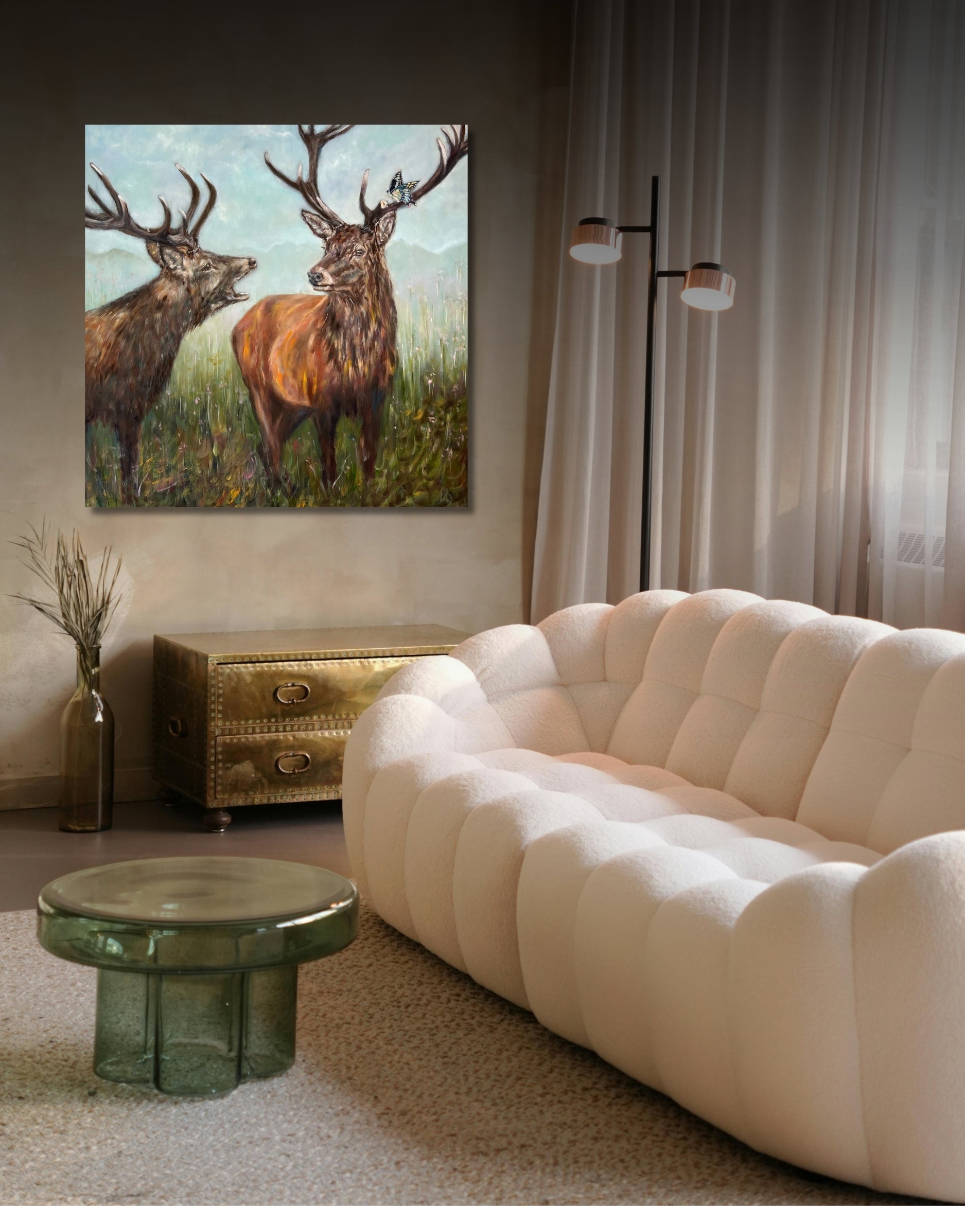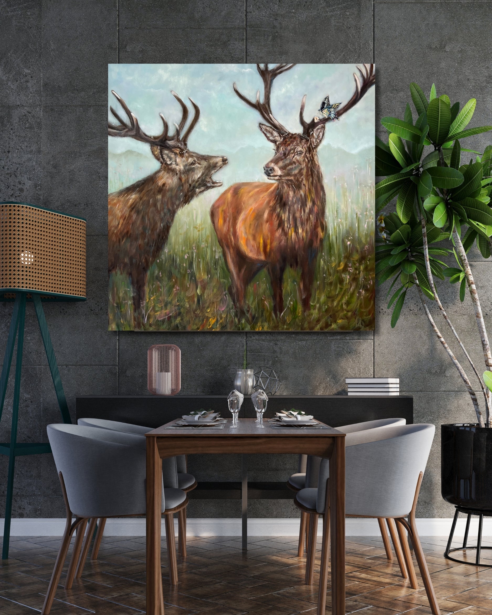 This painting began simply — two stags facing one another. But as I worked, something deeper revealed itself. On the left, one stag calls out, full of restless energy and emotion. On the right, the other stands quietly, gazing back with steady composure. His antler is broken, yet his presence feels grounded — as though he understands something the other has yet to learn.