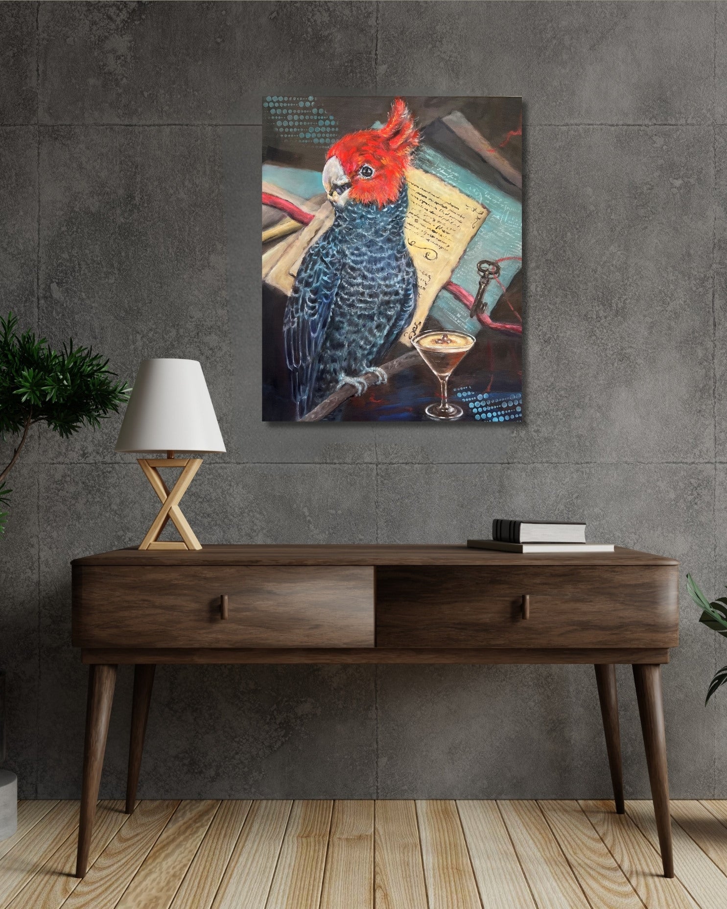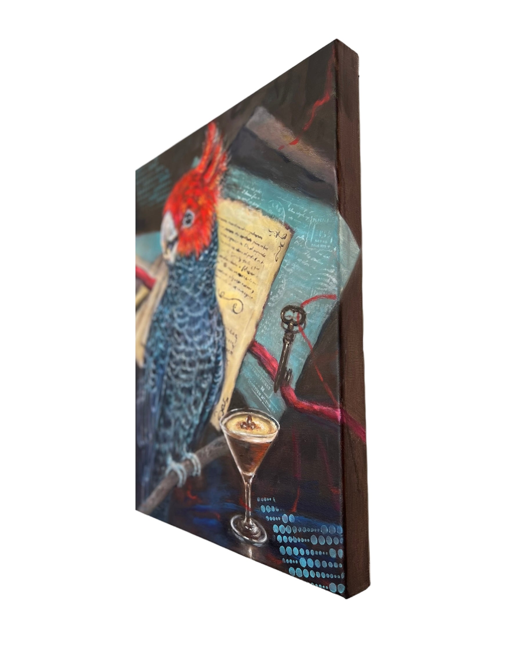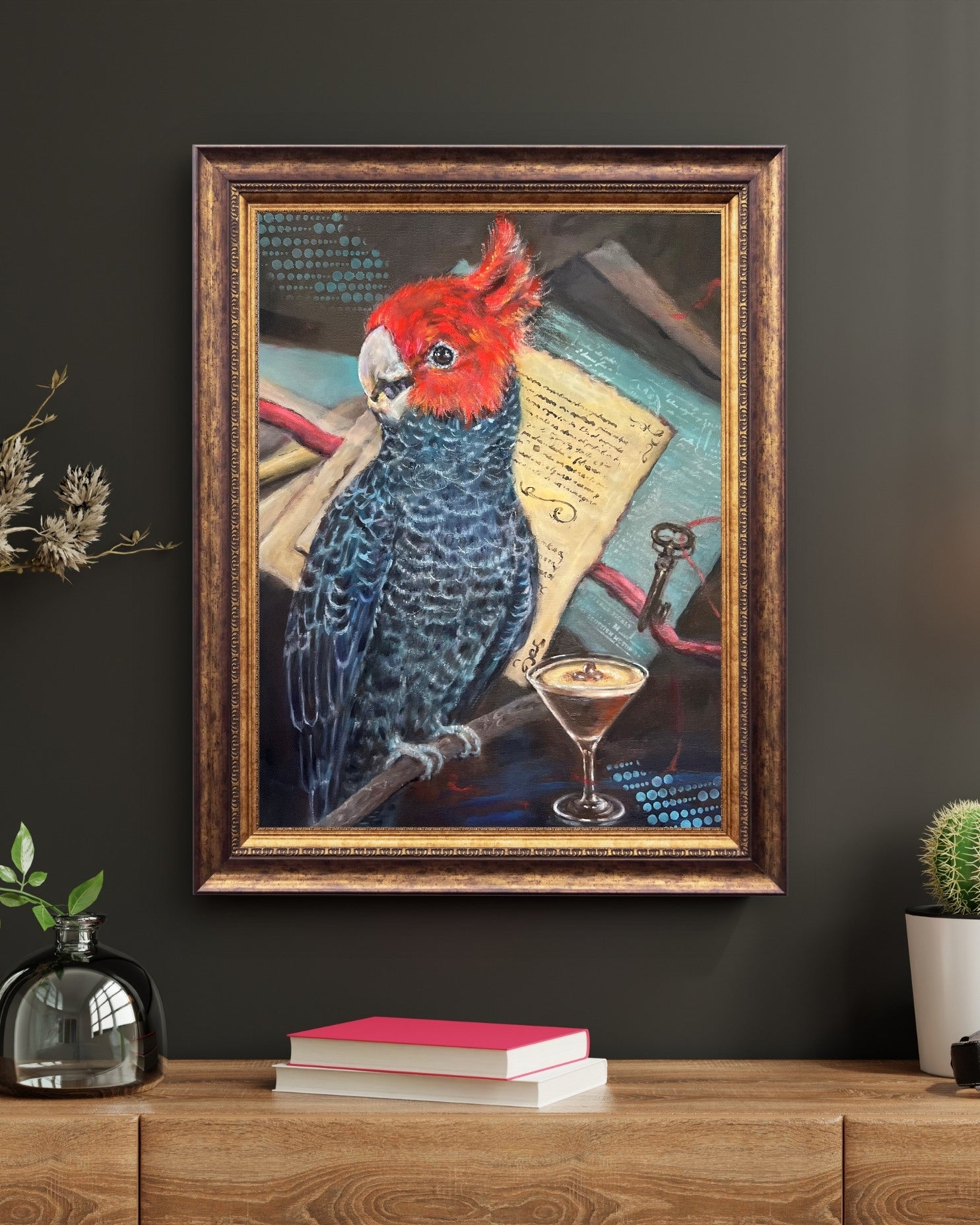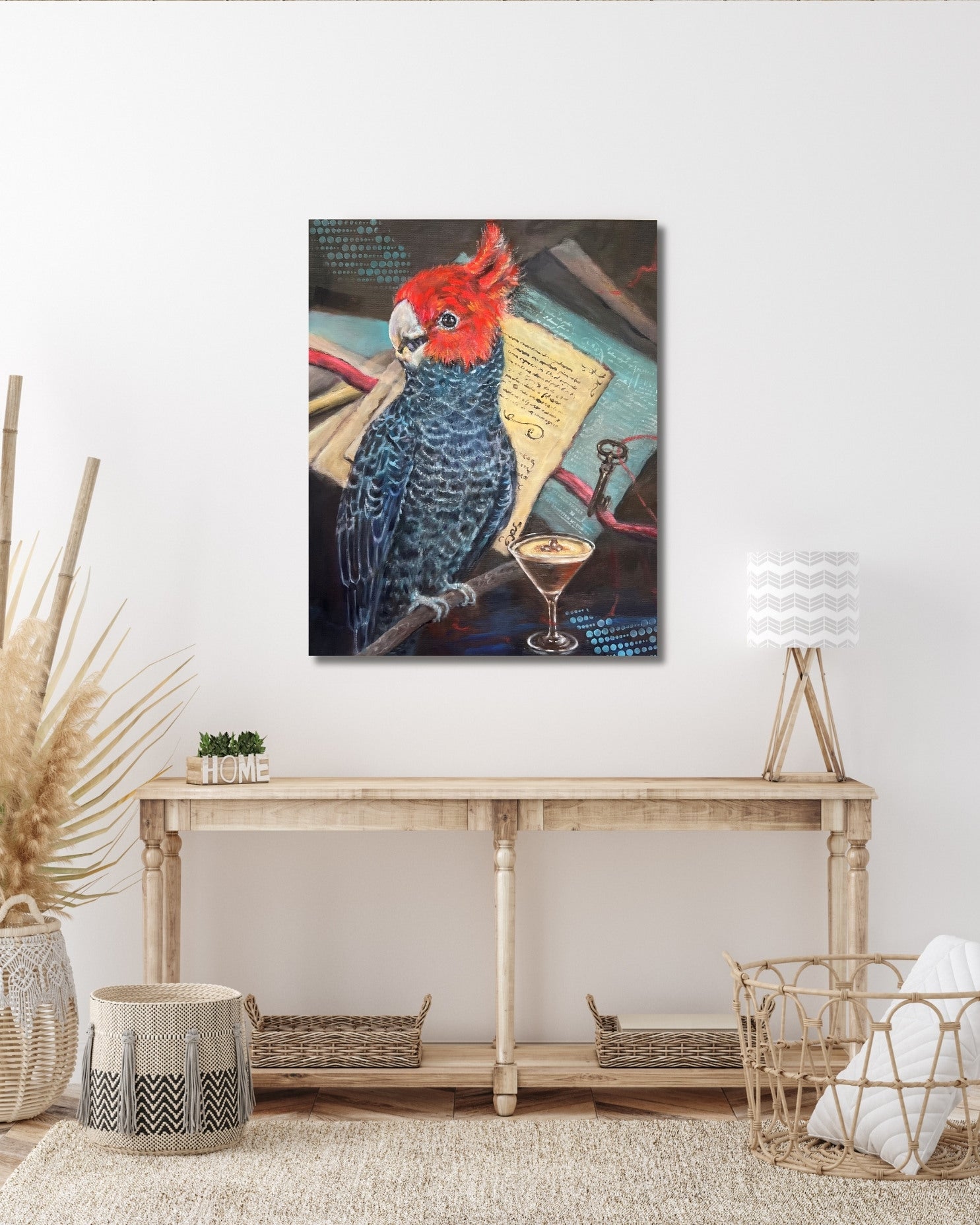 Part of my Brew and Bird Series, this piece combines humor, elegance, and a love for coffee culture with the unique beauty of Australian birdlife. The gang-gang cockatoo’s quirky presence pairs seamlessly with the sophistication of the cocktail, making it a statement artwork that sparks both joy and conversation.