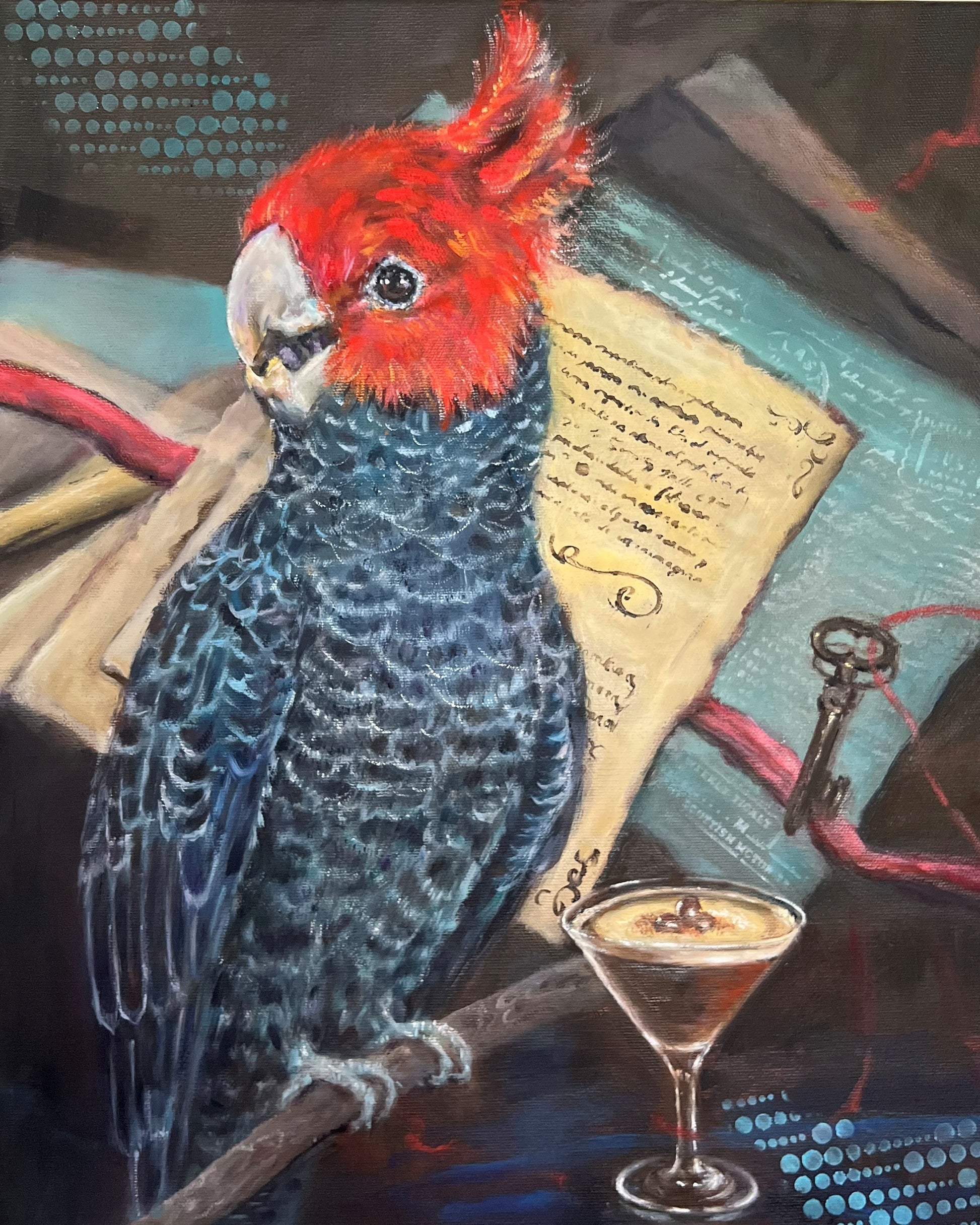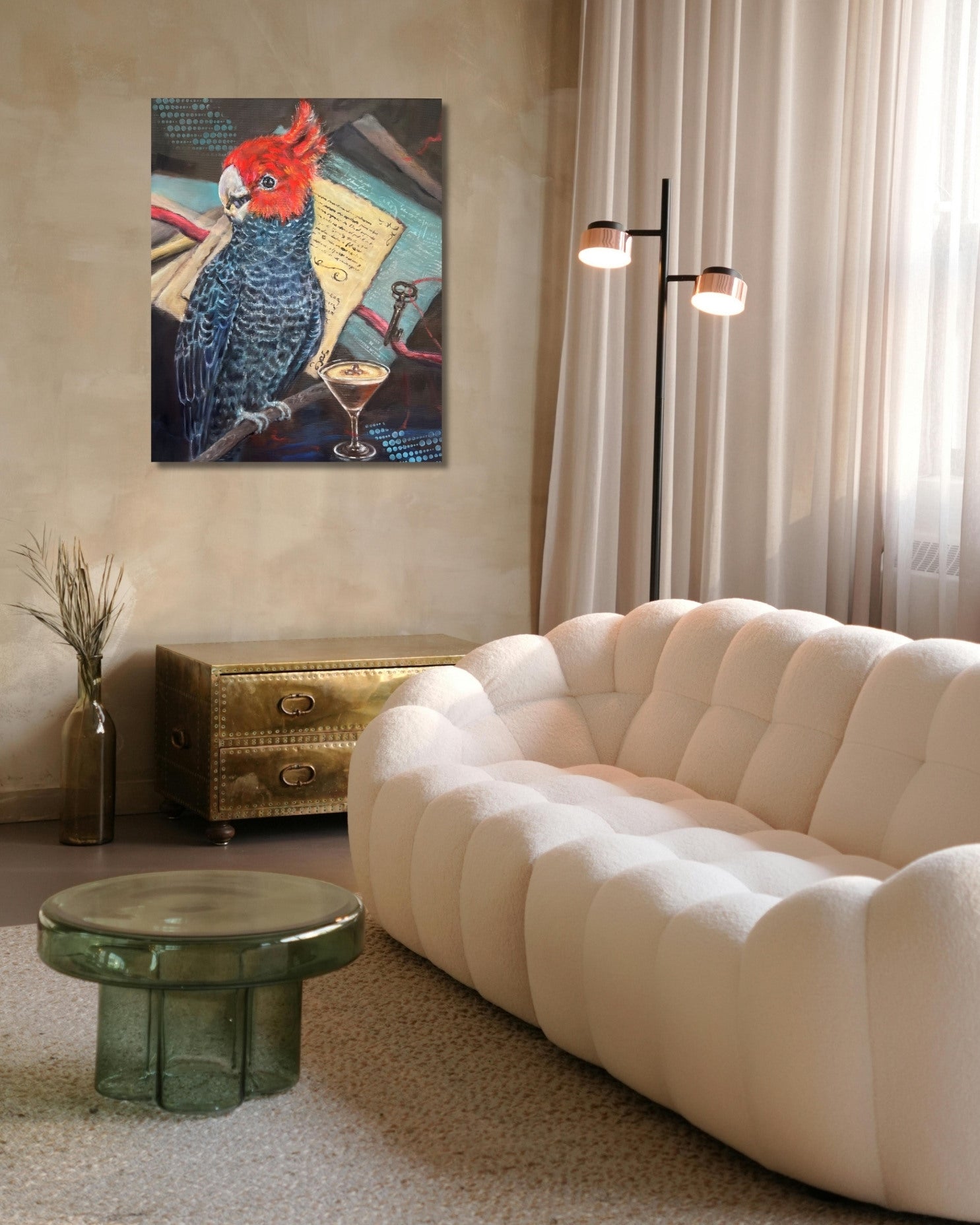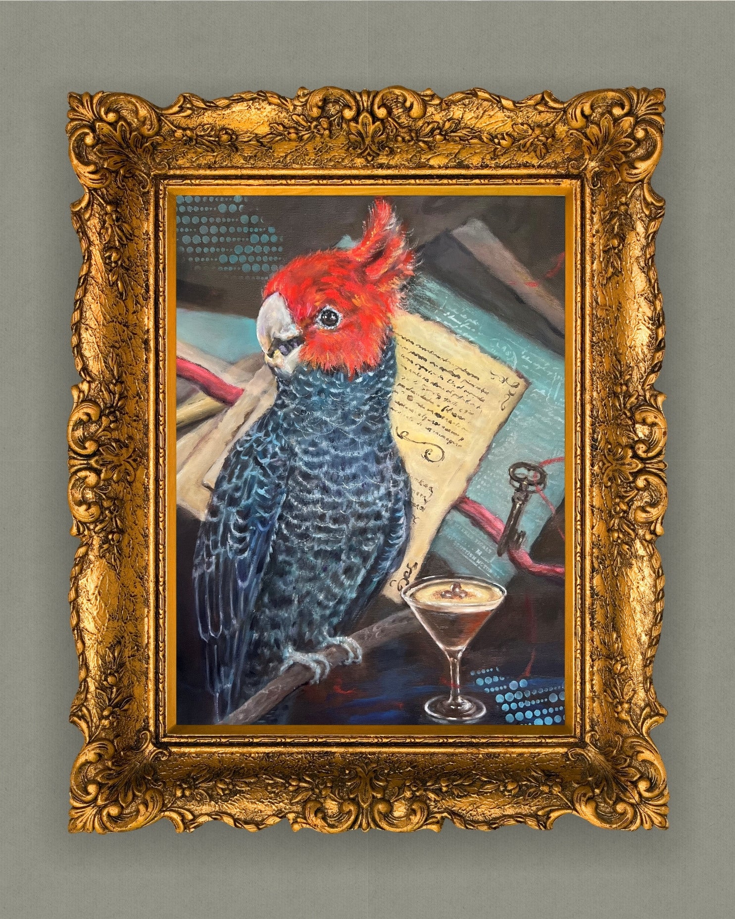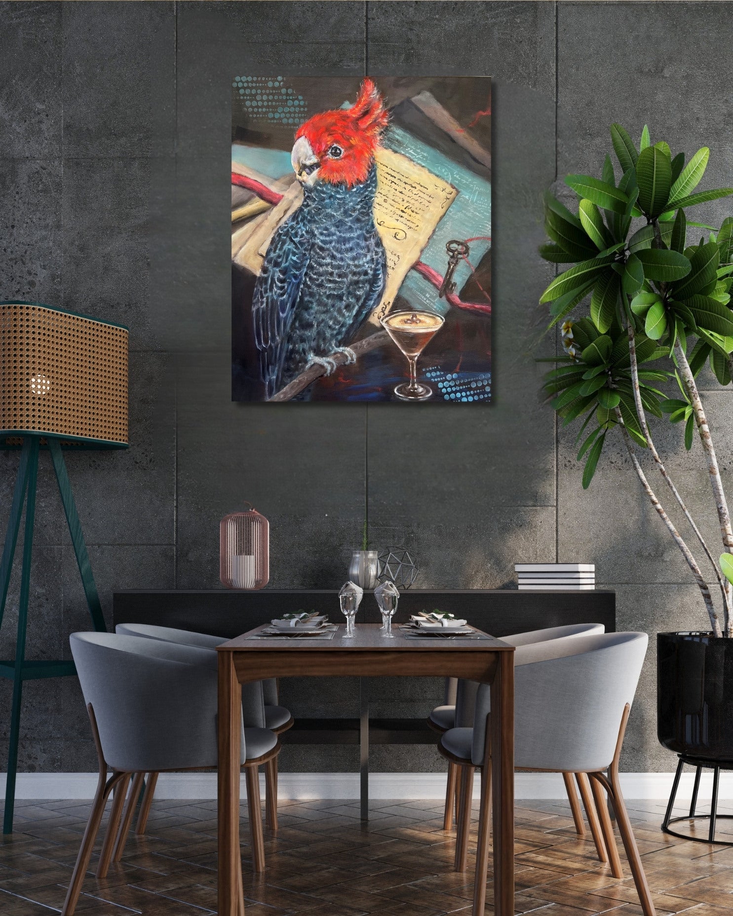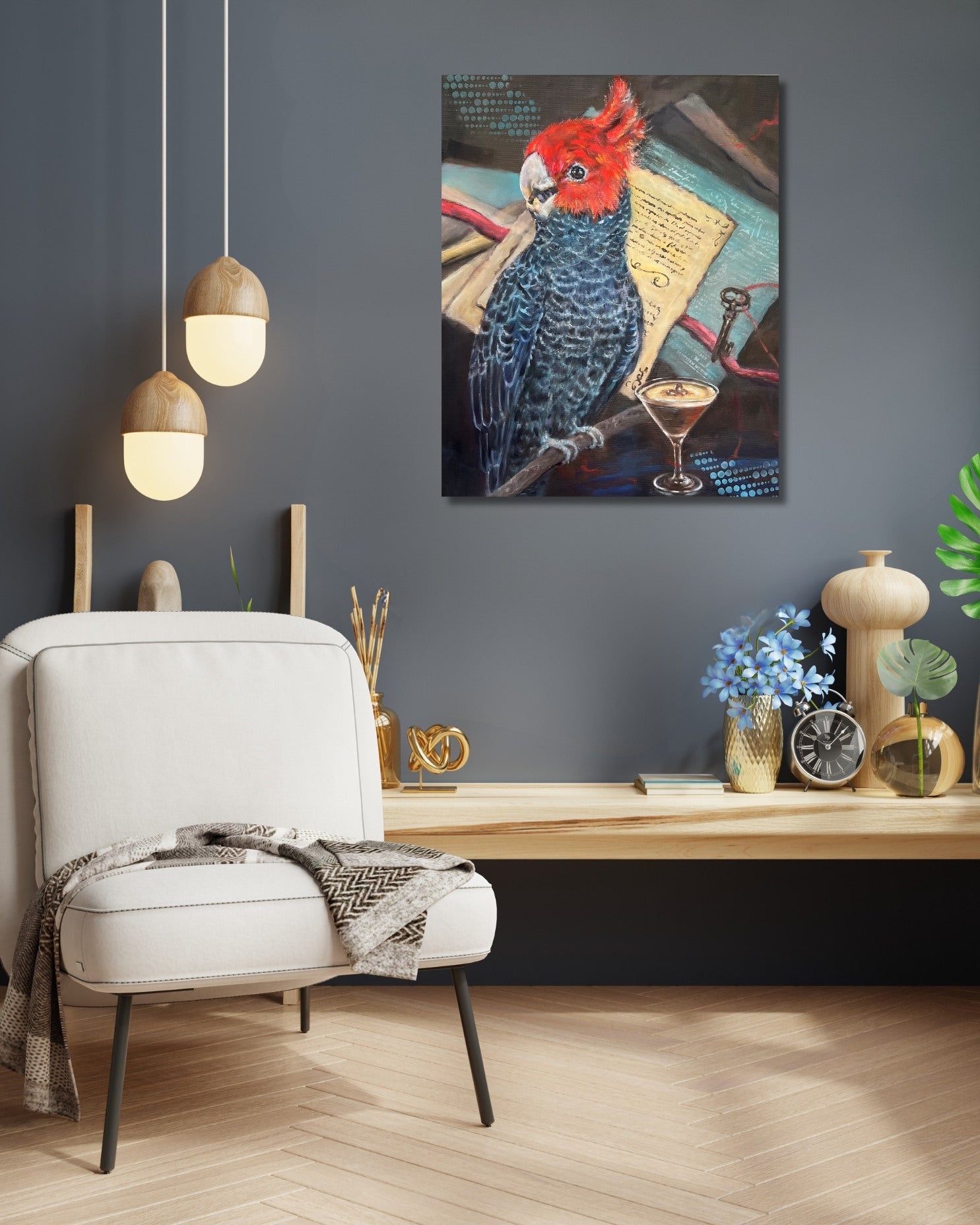 Part of my Brew and Bird Series, this piece combines humor, elegance, and a love for coffee culture with the unique beauty of Australian birdlife. The gang-gang cockatoo’s quirky presence pairs seamlessly with the sophistication of the cocktail, making it a statement artwork that sparks both joy and conversation.