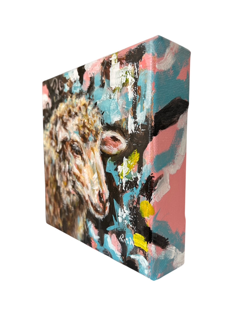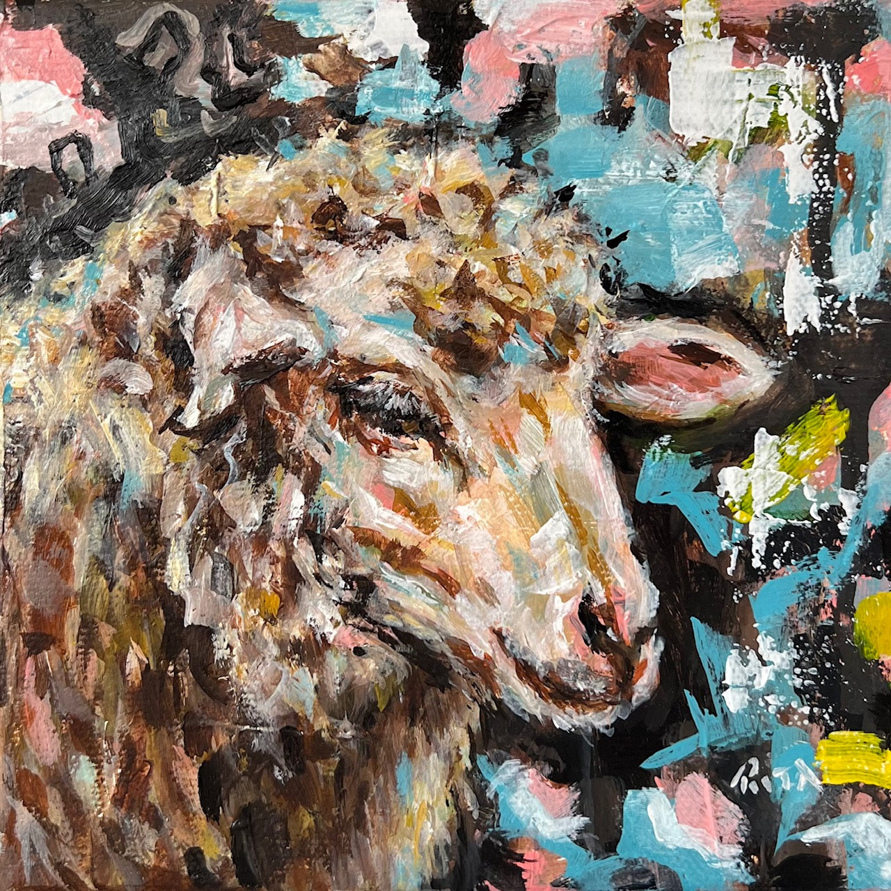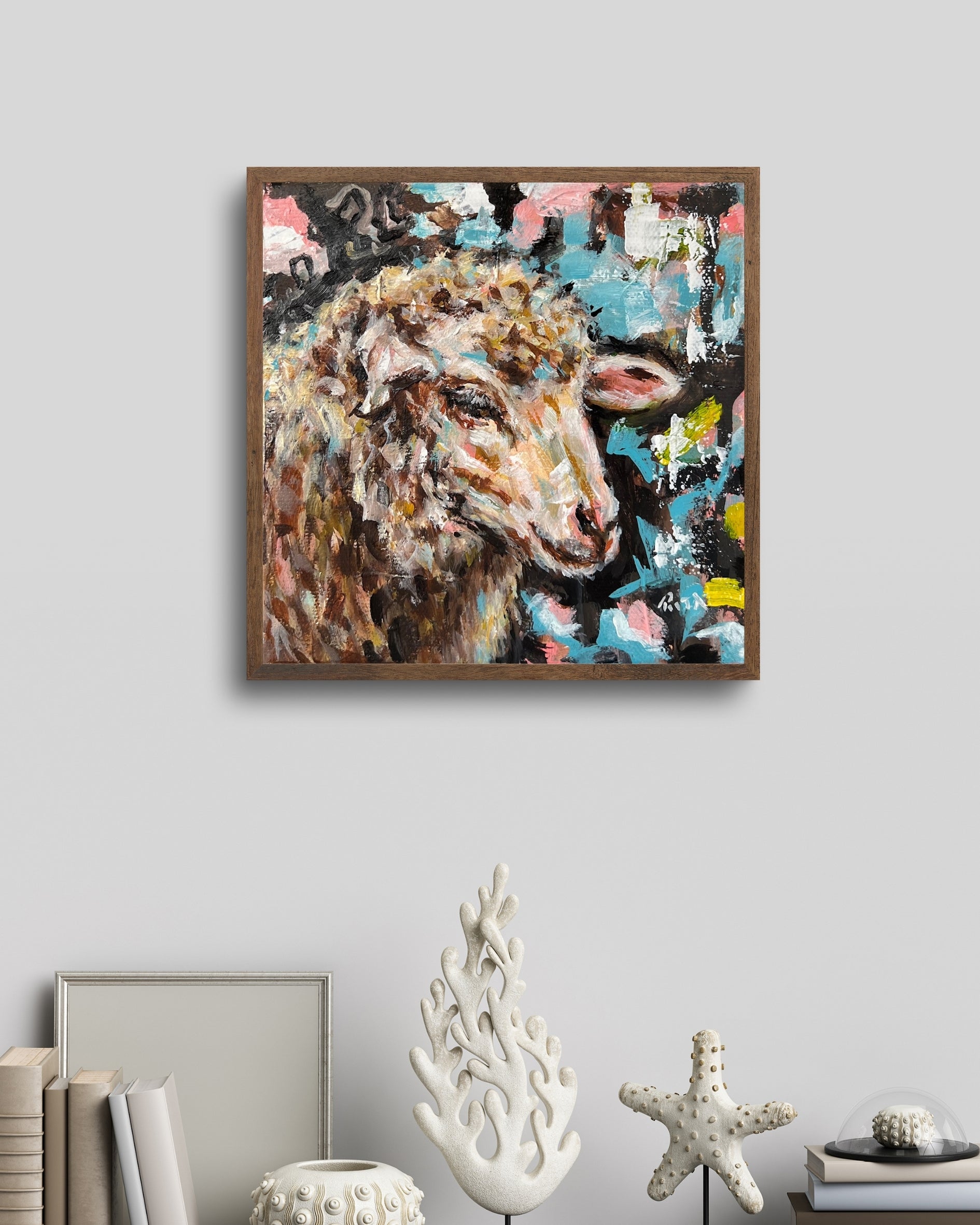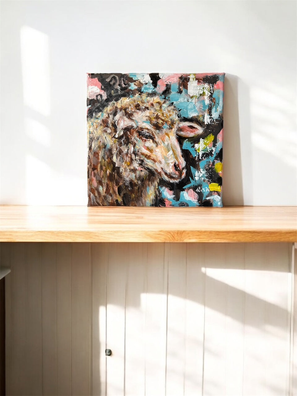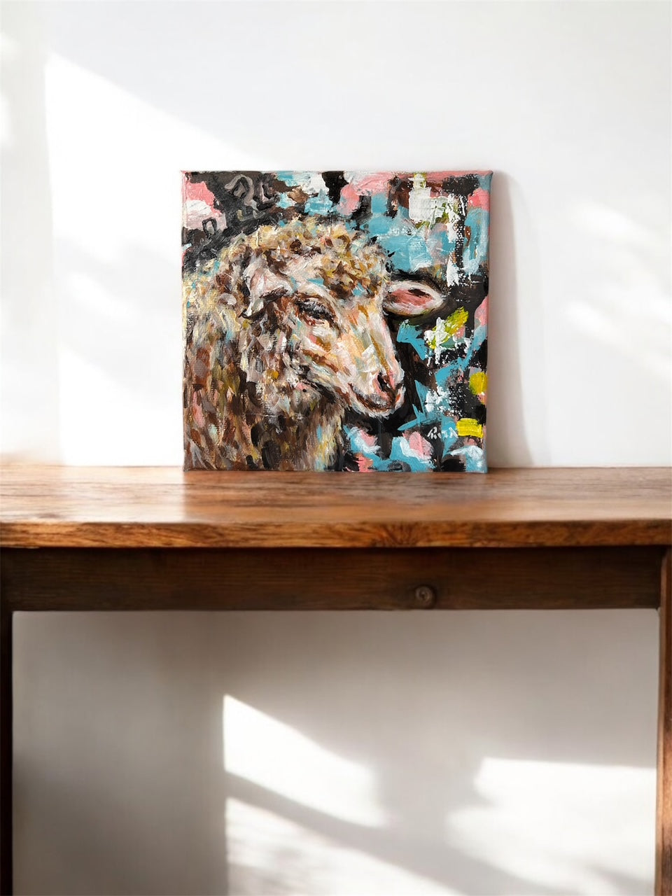 This acrylic sheep portrait features bold brushstrokes and a striking use of color. The sheep gazes downward to the right, its gentle expression balanced by a background of blue, pink, and black tones—bringing a contemporary edge to a classic subject. The energetic strokes give texture and life to the painting, while the color palette adds depth and emotion.