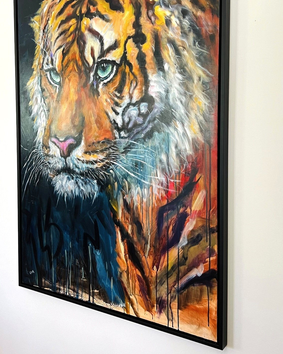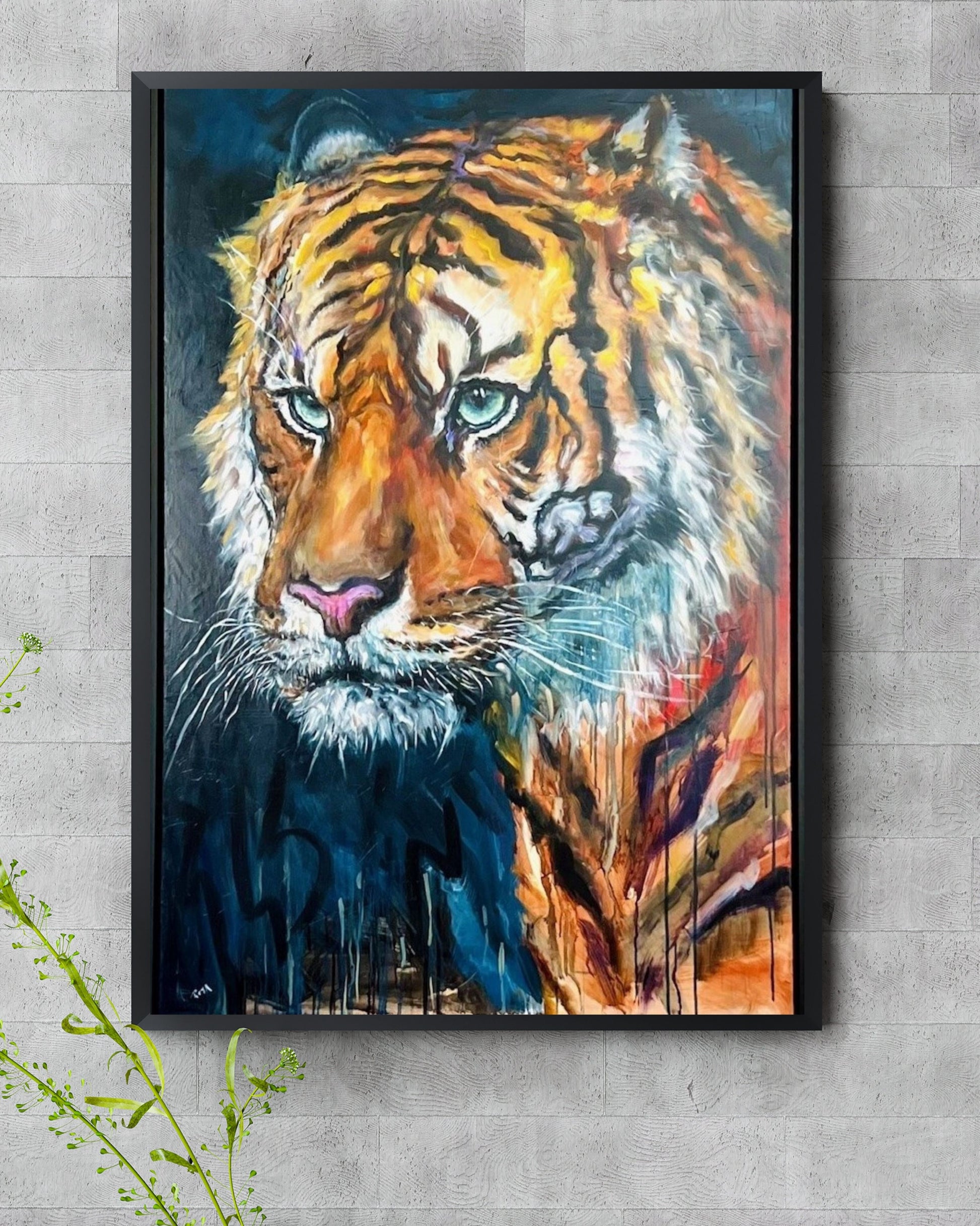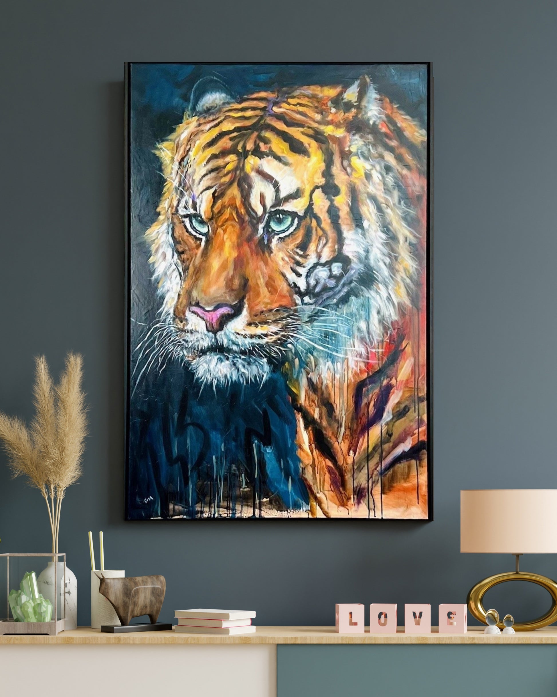 For collectors, this painting offers more than a striking image—it brings energy, character, and presence into your space. Expertly framed in a sleek black timber floating frame, it is ready to display immediately, transforming a home or office into a space of contemplation and admiration. It is ideal for those who love wildlife art, big cats, or expressive, contemporary paintings, offering both aesthetic pleasure and a meaningful connection to the natural world.
