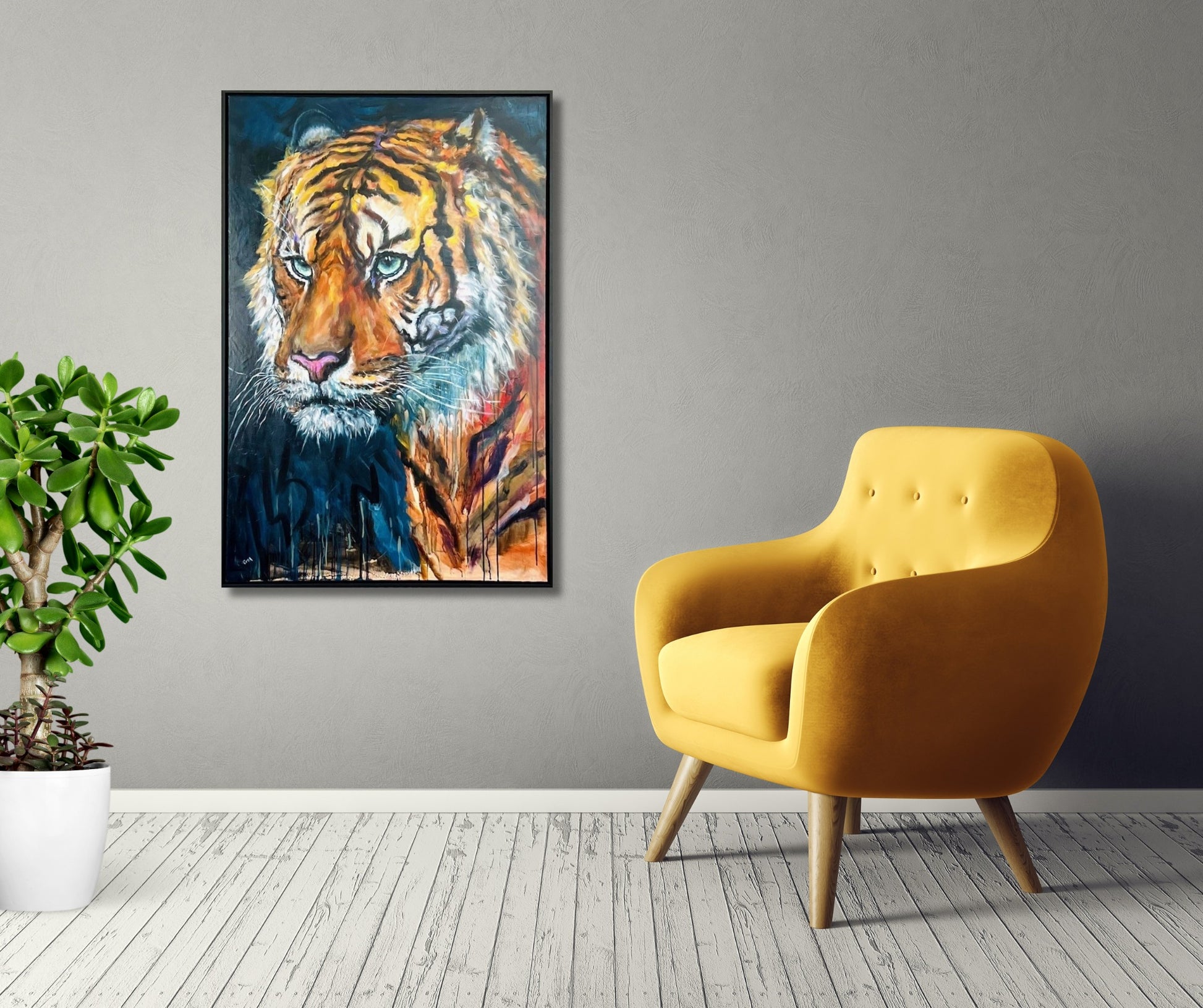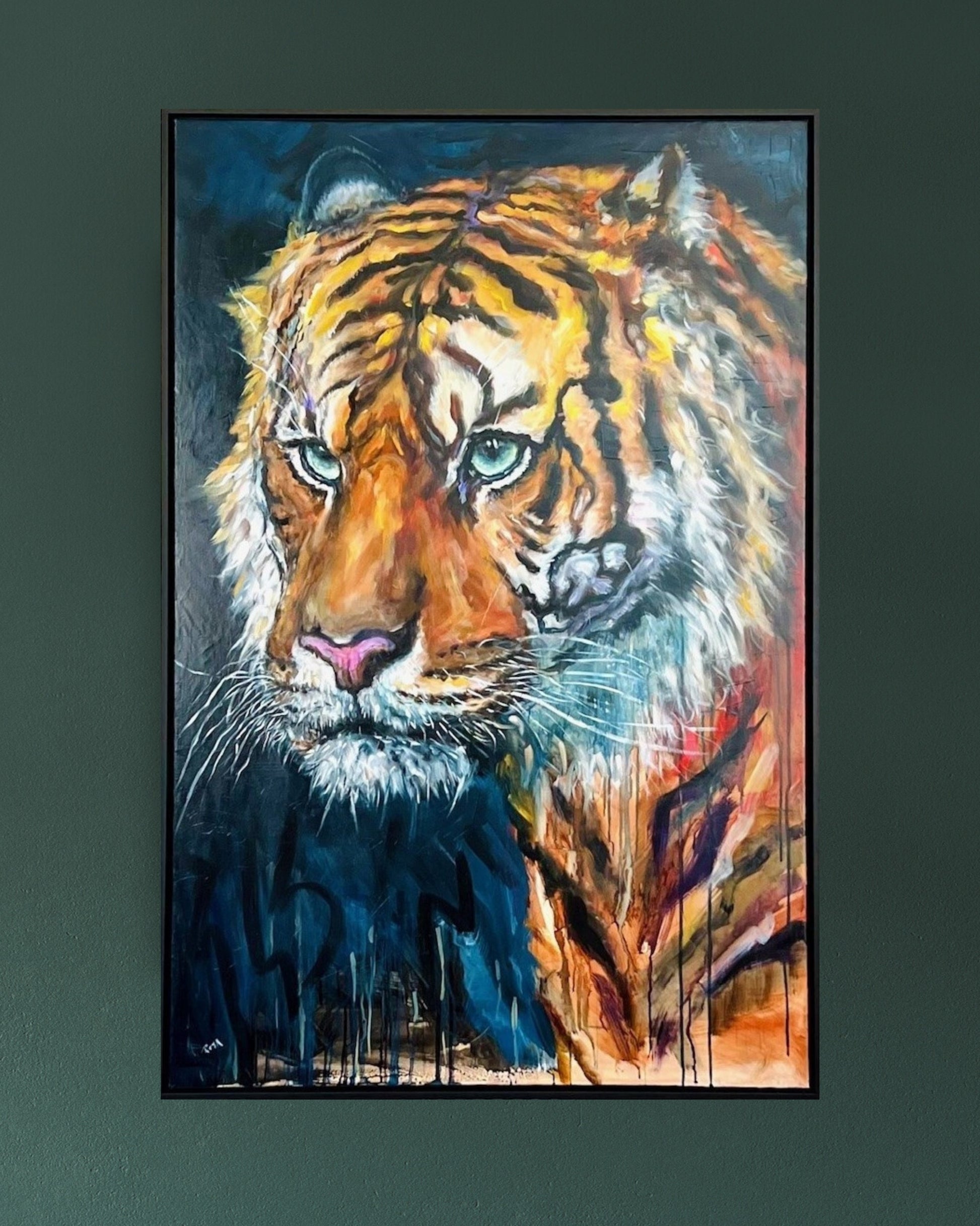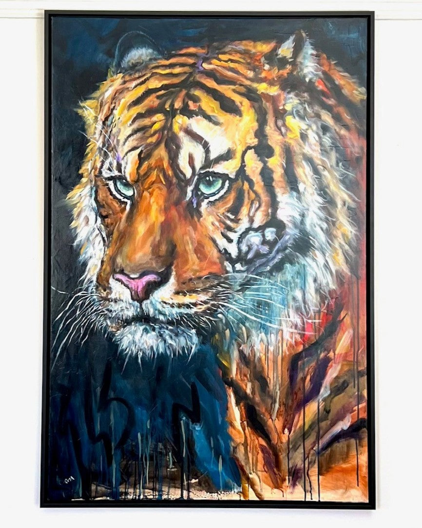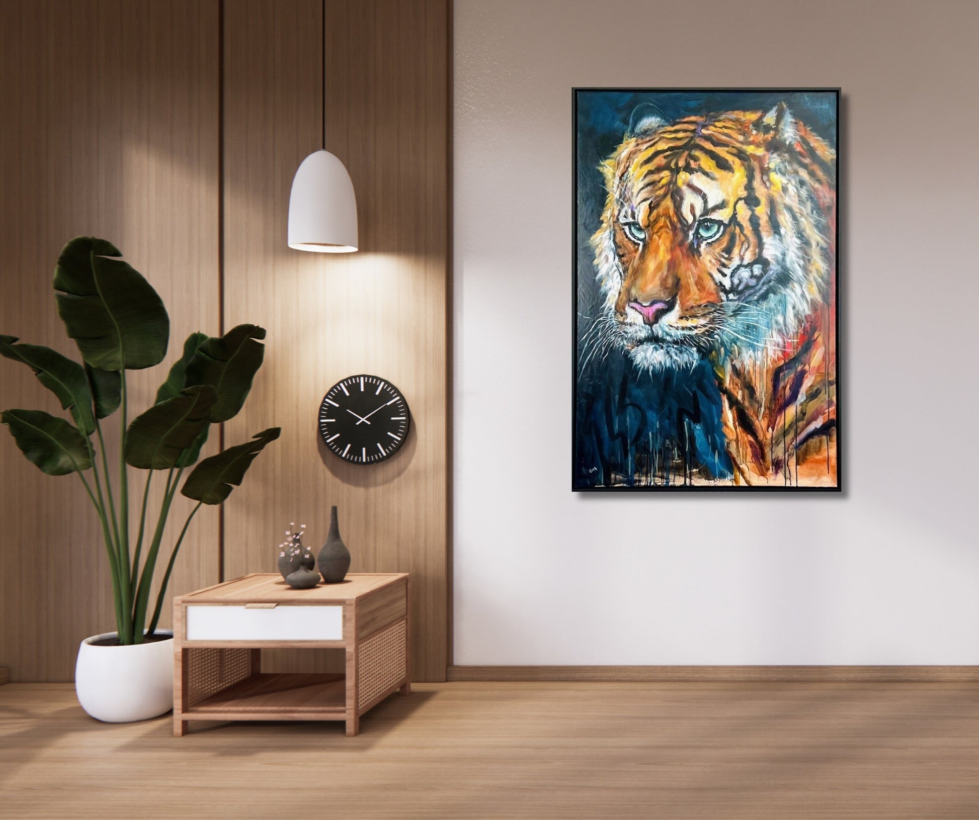 For collectors, this painting offers more than a striking image—it brings energy, character, and presence into your space. Expertly framed in a sleek black timber floating frame, it is ready to display immediately, transforming a home or office into a space of contemplation and admiration. It is ideal for those who love wildlife art, big cats, or expressive, contemporary paintings, offering both aesthetic pleasure and a meaningful connection to the natural world.