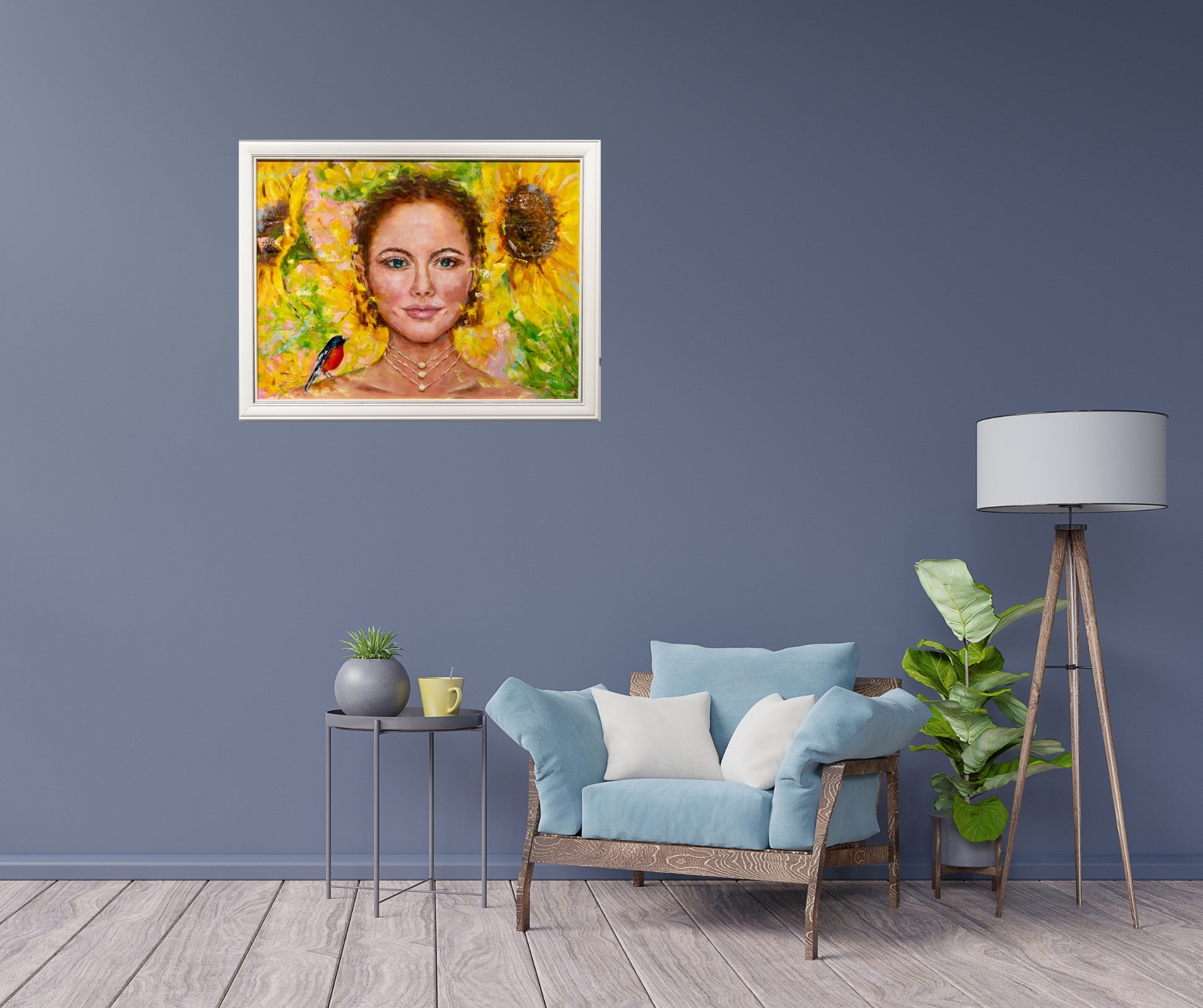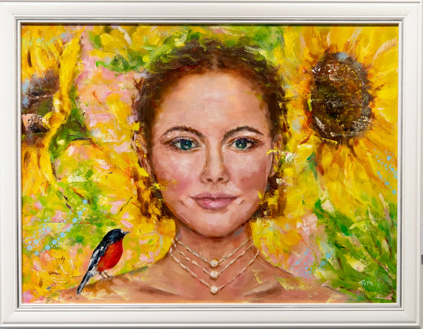 Sunflower Serenade features a peaceful girl surrounded by bright, cheerful sunflowers, with a gentle Scarlet Robin resting on her shoulder. The mix of warm yellow tones and soft details creates a joyful, calming feel—offering a quiet moment of connection between people and nature.