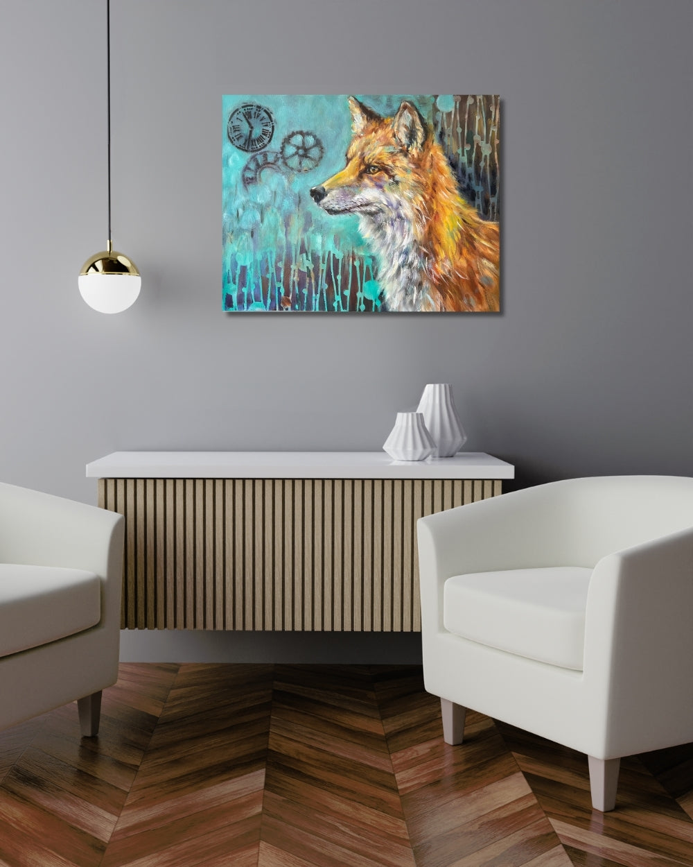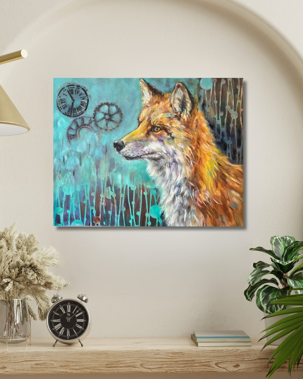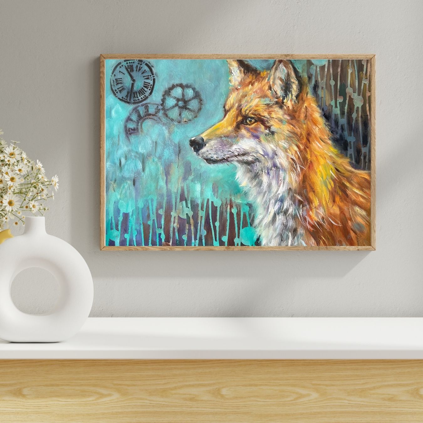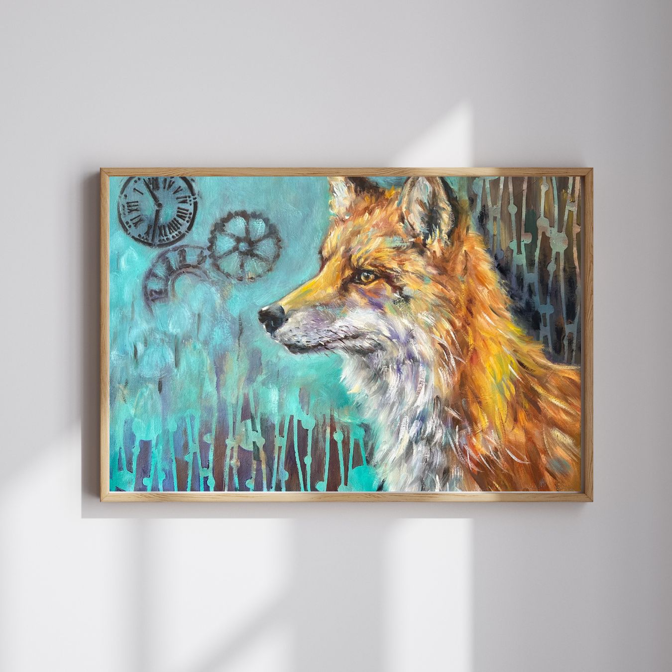 In Reflections of Time, the quiet gaze of a fox invites us into a moment of contemplation. Its expression—wise, tender, and touched with melancholy—seems to hold an understanding of life’s fleeting nature. Behind the fox, a soft mint-green background carries symbols of time: a wheel, a clock, and scattered numbers, each echoing the steady forward motion of existence.