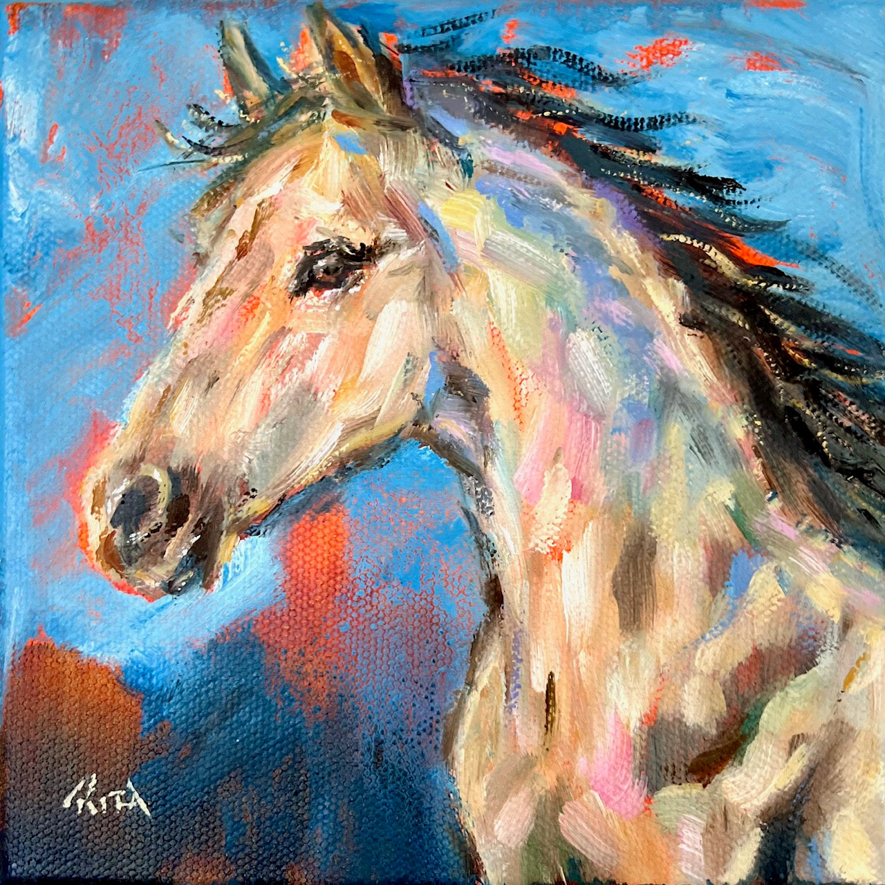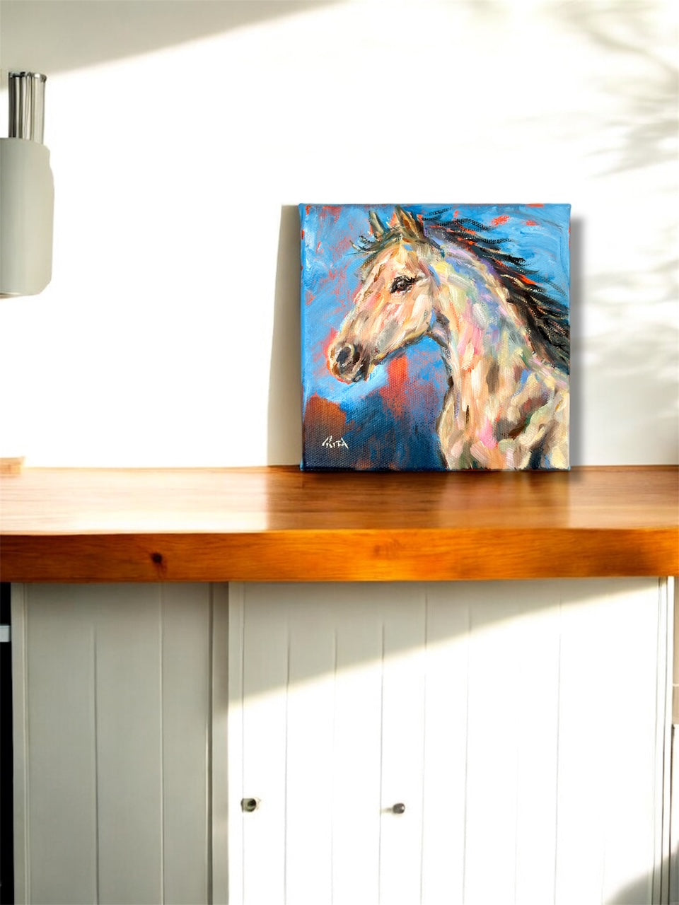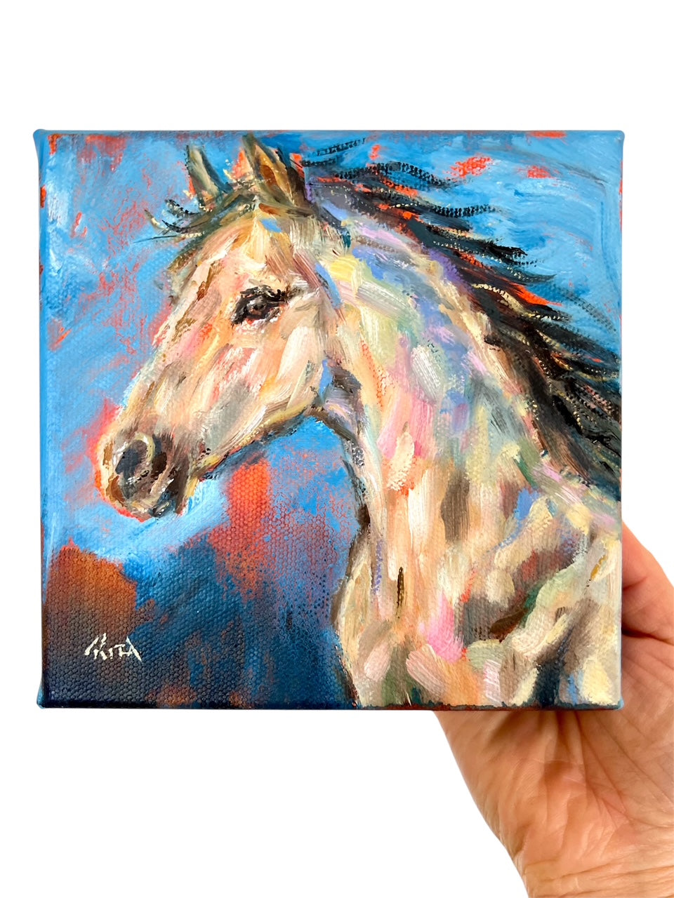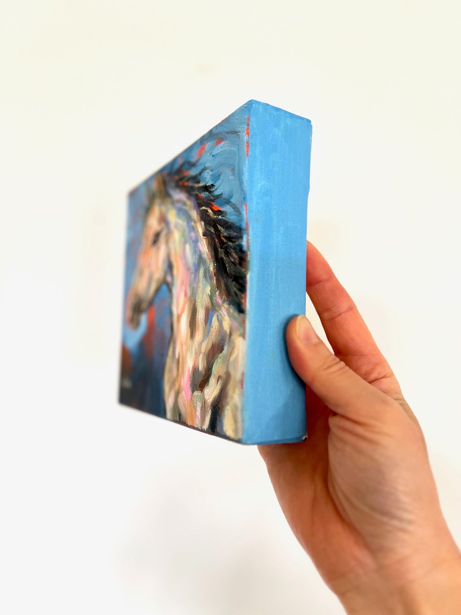This small oil painting features a cream-colored horse against a soft yet vibrant backdrop of orange, navy, and blue. The graceful form of the horse embodies a sense of freedom, captured through gentle brushstrokes and harmonious colors.
